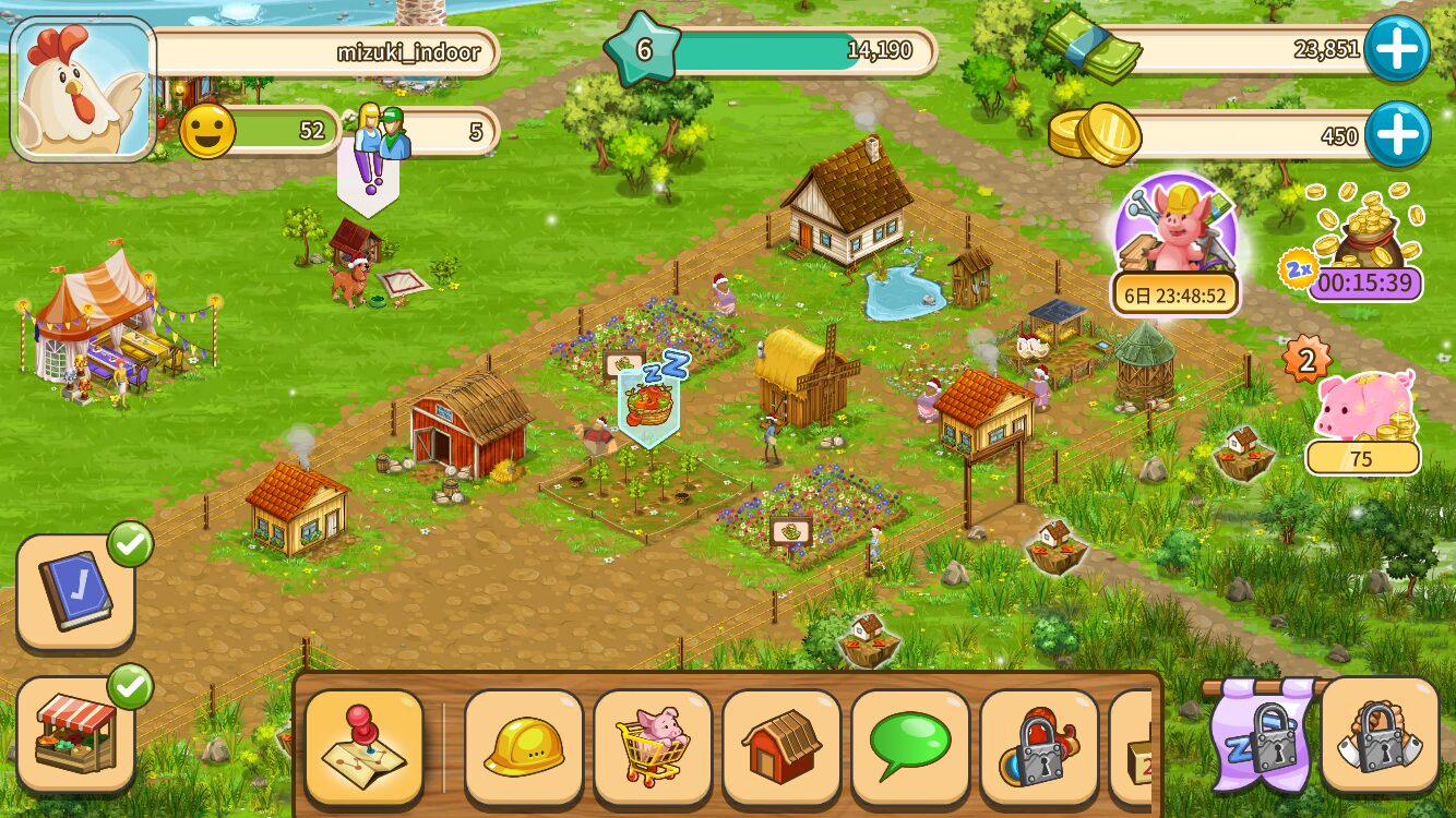- 作物や動物の収穫時間はリアルタイムで進行します!収穫時間の短い作物は特に頻繁にチェックして、タイミングよく収穫をしていこう♪